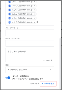 - Google グループのメンバー追加画面を開き、2でコピーしたユーザを貼り付けてください。
