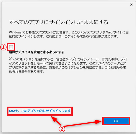 - 「組織がデバイスを管理できるようにする」のチェックを外してください。