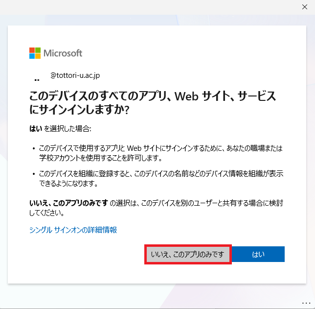 Officeアプリのみに鳥大IDでサインインしたい場合は「いいえ、このアプリのみにサインインします」を選択してください。 - 「このデバイスのすべてのアプリ、Webサイト、サービスにサインインしますか?」が表示された場合